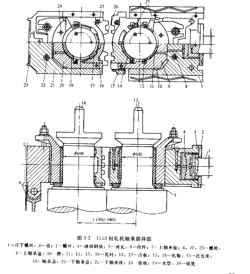 1150初軋機軋輥部件的結(jié)構(gòu)圖及立體示意圖如圖 3-2 及圖3-3所示。上軋輥放置在上軸承盒9及托瓦座 15 之間。瓦襯都是夾布膠木瓦,上軸承盒中有徑向瓦襯11 及肩瓦5,托瓦座中同樣也有徑向瓦襯14 及肩瓦。徑向瓦襯是用壓板 12定位。上軸承盒的腿插入托瓦座,并用螺栓 25緊固連接。初軋機與型鋼軋機不同點在于;在上軸承盒及機架間尚有一個上軸承座 7,上軸承座通過球面銅墊 4 與壓下螺絲1相接觸。軋制時,軋制壓力通過上軸承盒、上軸承座、球墊、壓下螺絲較終傳遞給機架上橫梁。在上軸承盒的上部有兩個突耳,突耳通過固定在上軸承座的螺栓 8使軋輥進行軸向調(diào)整。這種軸向調(diào)整的形式對于上軋輥移動量極大且次數(shù)頻繁的初軋機是較理想的,這也是軋輥部件中多設置一個上軸承座的原因所在。上軸承座法蘭內(nèi)側(cè)鑲有耐磨滑板 28。