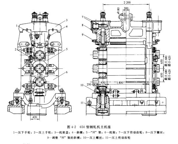 圖4-2所示為650型鋼軋機主機座,主機座中上,中,下三個軋輥旋轉(zhuǎn)方向固定不變,在中下輥之間交替過鋼,實現(xiàn)多道次往復軋制。中輥位置固定,上下輥分別通過壓下裝置和壓上裝置進行徑向調(diào)整,以保證孔型的要求。壓上,壓下均采用手動裝置,軋輥在軋制過程中實不調(diào)整的,只有在換輥之后和軸瓦磨損時才進行調(diào)整。上輥的調(diào)整量小,一般采用簡單的彈簧平衡。
