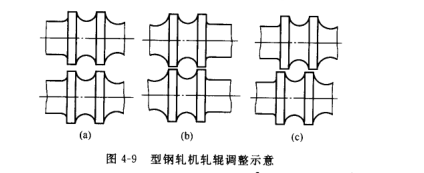 圖4-9(b)所示為正確孔型位置;圖(a)輥縫過大,必須進行上,下徑調(diào)整,他由壓下裝置或壓上裝置來完成;圖(c)為上,下輥槽左右沒有對中,必須進行左右軸向調(diào)整。