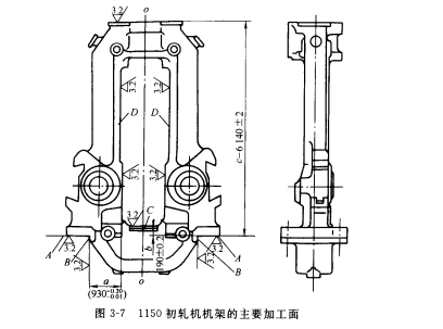 機架是軋鋼機主要零部件,為了保證正常軋制,為了保證必要的軋制精度及安裝調(diào)整的方便,對機架的機械加工有嚴格的要求。下面以1150初軋機機架為例,簡單地介紹機架加工方面的技術(shù)要求(見圖3-7)