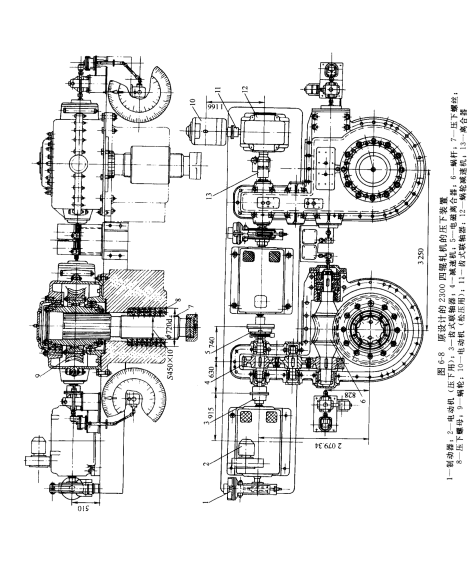 在 2300四輥熱軋鋼板軋機(jī)上有兩組壓下裝置,如圖 6-7、圖6-8所示。軋機(jī)的壓下速度為 2~12mm/s。兩組壓下裝置可以同時(shí)壓下調(diào)整,也可以在脫開電磁離合器5后進(jìn)行單獨(dú)壓下調(diào)整。
